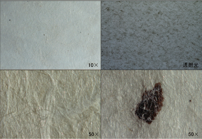 構(gòu)皮纖維雖不及麻纖維那么長,但遠(yuǎn)長于竹纖維,一般在5-10mm 左右。由于構(gòu)皮本身具有一定的白度,纖維素含量也比較高,因此構(gòu)皮紙成紙白度一般要高于麻紙和竹紙,構(gòu)皮紙質(zhì)地較麻紙綿軟,韌性好,常被稱為“白棉紙”,亦有“蟬翼”、“冰肌”等雅喻。構(gòu)皮紙紙面的勻度和平滑度一般介于麻紙和竹紙之間,由于蒸煮過程中用到草木灰,構(gòu)皮紙一般潔白中略偏灰色,紙面纖維在光線照射下會泛出絲質(zhì)光澤。由于纖維較長不易分散,成紙內(nèi)常見有未打散的纖維束,形態(tài)蜿蜒曲折,兩端多散開呈絮狀(如圖1 左下)。構(gòu)皮紙在存放一段時間之后,紙面常見有零星的淺銹黃色暈點狀氧化斑,曾有文人墨客因此雅稱其為“桃花紙”。另外,手工抄造的構(gòu)皮紙在纖維間還常會殘留一些構(gòu)皮外皮的黑灰色碎屑,這也是構(gòu)皮紙的一個特征(如圖1 右下)。