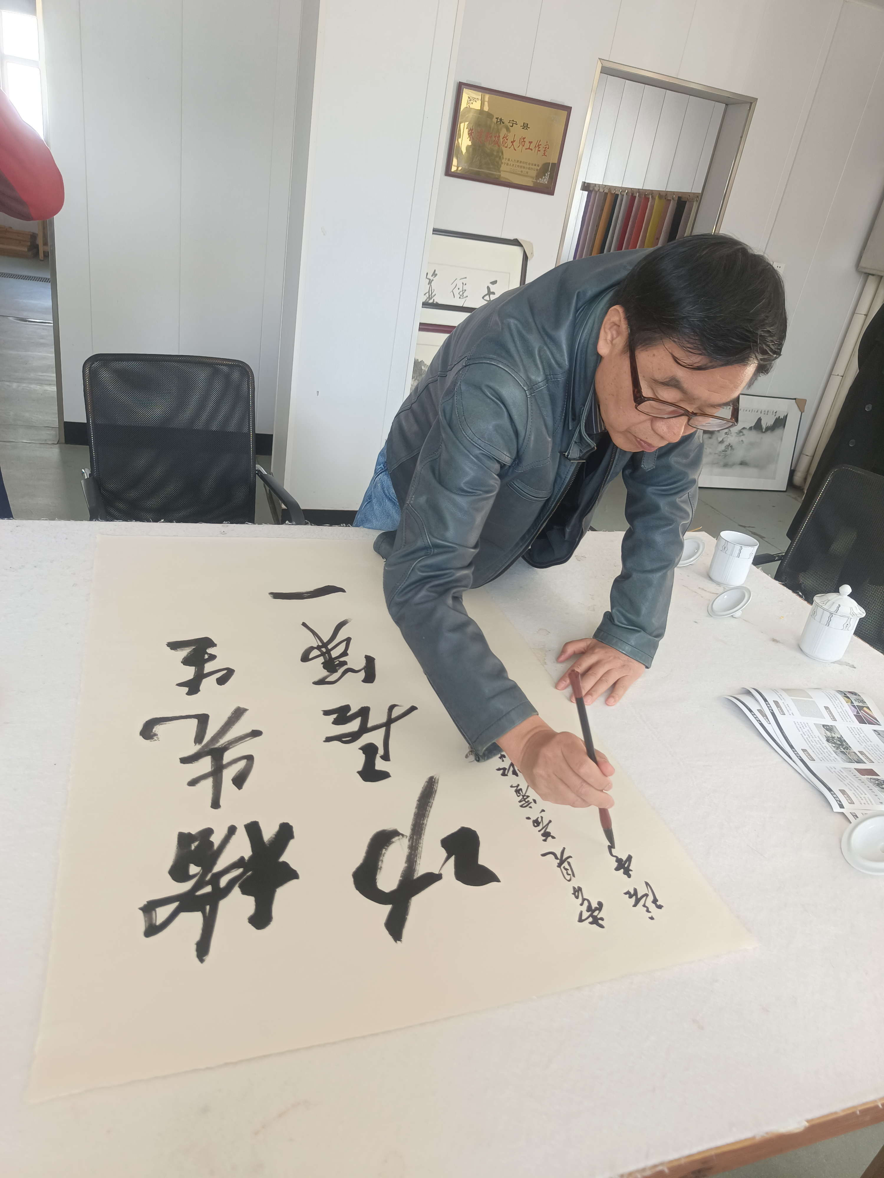 近距離觀摩大師創(chuàng)作,著名畫家李庚老師和著名文化學(xué)者、書法家王魯湘老師抽出寶貴時間來公司指導(dǎo)試筆,并為我們留下三幅珍貴墨寶,這是對我們做徽州皮紙的肯定,也是對我們的鞭策,使我們更有信心堅守敬畏之心,匠人精神,做出更好的徽州皮紙。感謝安徽書法協(xié)會會長王云龍全程陪同